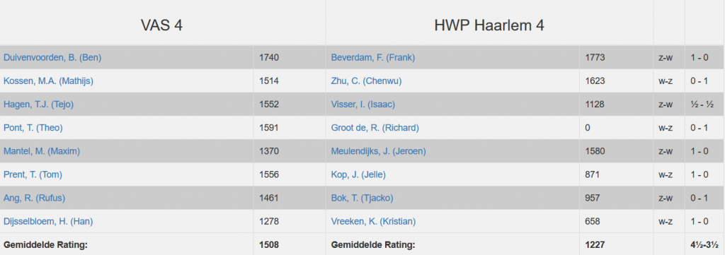 Met een elo gemiddelde van 400 punten meer had het op papier een makkelijke dag moeten zijn. Uiteindelijk was het met de hakken over de sloot. Met 4.5-3.5 winnen we en behouden we 100% resultaat dit seizoen.