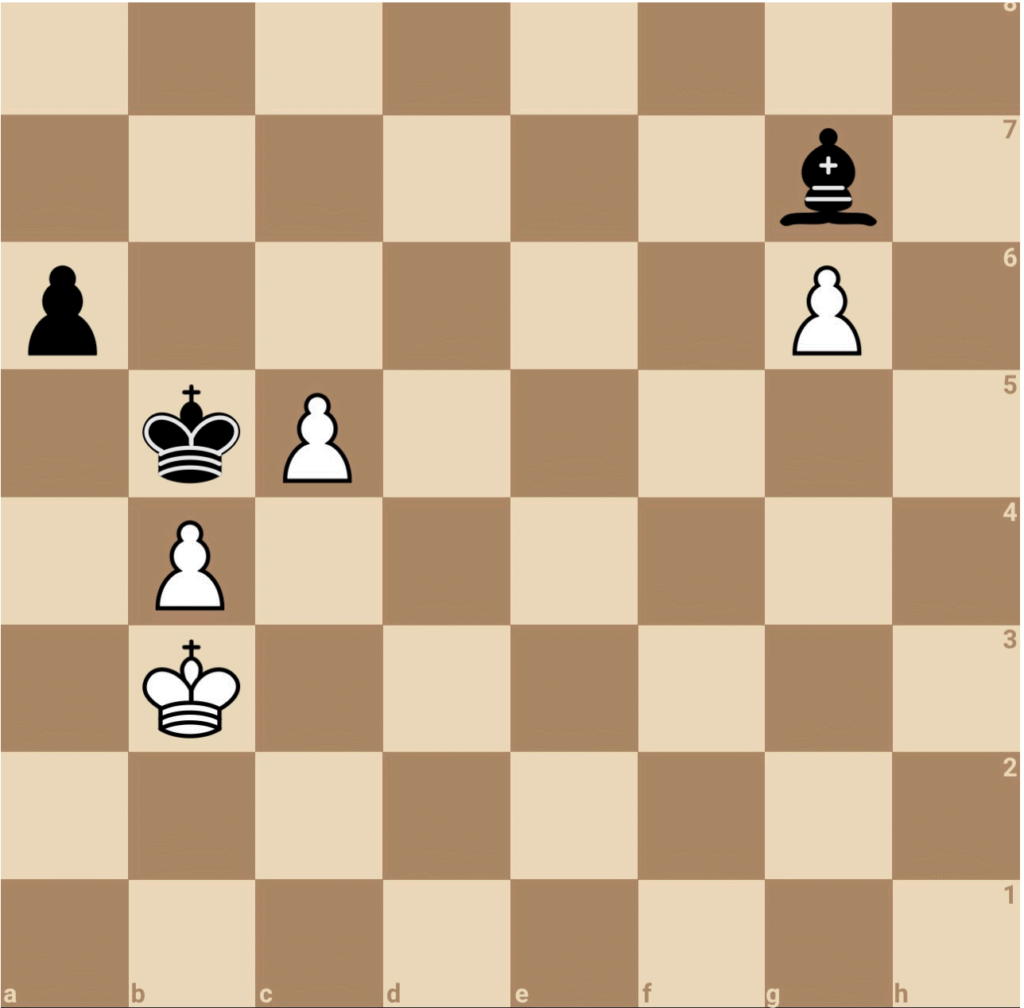 En toen kregen we een onnavolgbare apotheose. Bart speelde sterk tegen de topscorer en teamleider van Moira-Domtoren. Helaas moest hij in het eindspel zijn loper geven, maar de tegenstander had nog maar 1 loper en 1 pion en Bart had een gevaarlijke vrij pion. Deze stelling kwam op het bord: