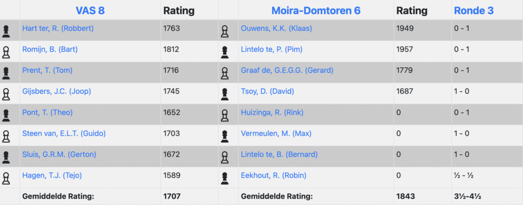 Onze tegenstander , het jeugdteam Moira-Domtoren 6, was uit ontzag – we stonden bovenaan – of uit angst – er geldt in de zesde klasse dit jaar een versterkte degradatie om een zevende klasse te creëren- behoorlijk versterkt naar Amsterdam gekomen. Op het eerste bord was Klaas Ouwens opgesteld, vorig jaar nog succesvol basisspeler van het eerste in de 3e klasse en zelfs deze maand nog invaller in datzelfde eerste. Tja, het lijkt allemaal te mogen, verder laat ik het oordeel maar aan de lezer.