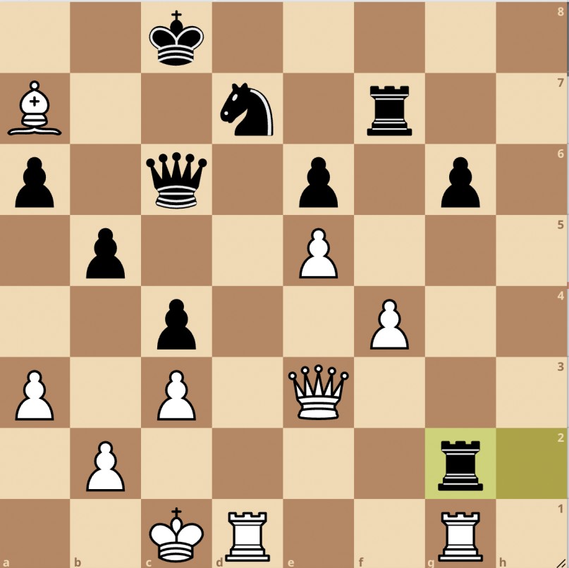De koning gaat hier naar f7 en de dame via g8 (!) naar h7. Dit moet aanvalsspeler Shirov toch waarderen. Hij ruilde hier dames en offerde toen materiaal in een poging de partij naar zijn hand te zetten. Eline speelde echter nagenoeg foutloos en verslaat misschien wel de grootste scalp uit haar carriere!