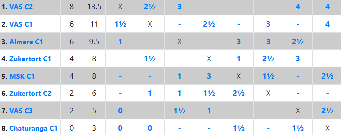 Altijd mooi is een overwinning op Suikertaart. Dat lukte VAS C6 met overtuigende cijfers: eerst 4-0 en daarna 3-1. Atlas, Sami, Nina en Escher zijn dus scherp bij de les! Wie weet slepen ze het kampioenschap binnen? Ze staan twee matchpunten achter, maar wel al voor in bordpunten.