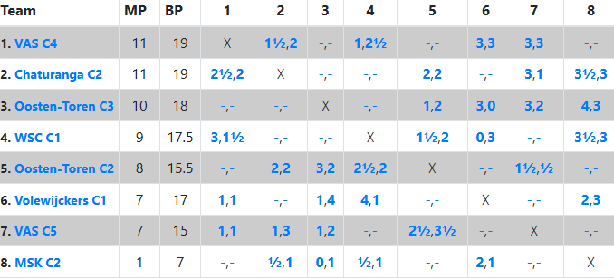 VAS C7 maakt ook goede kans op een podiumplek in deze klasse. Er werd een matchpunt gemorst, maar belangrijker: drie matchpunten gesnoept! Dat kan alleen dankzij Thibault, Jesse, Daniel en Joaquin die allemaal goed vooruitgaan in het schaken.