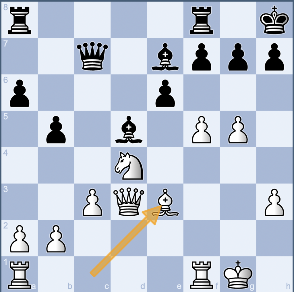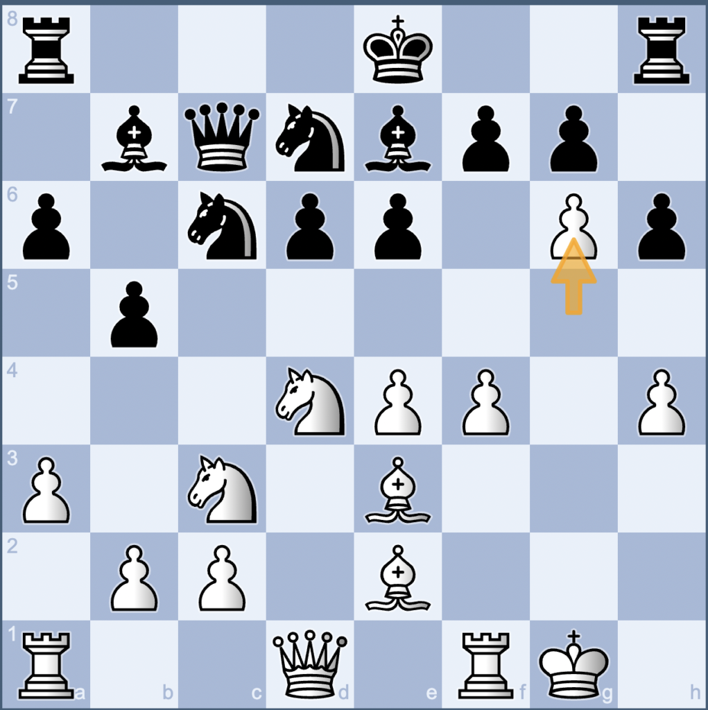 Op 1 van de topborden troffen Vadym en Ben elkaar. Na enige tijd spelen kwamen ze naar beneden en Ben zei weemoedig dat zijn laatste zet extra aandacht verdiende. Dus bij deze; wit speelt Le3 als laatste zet in onderstaande stelling.