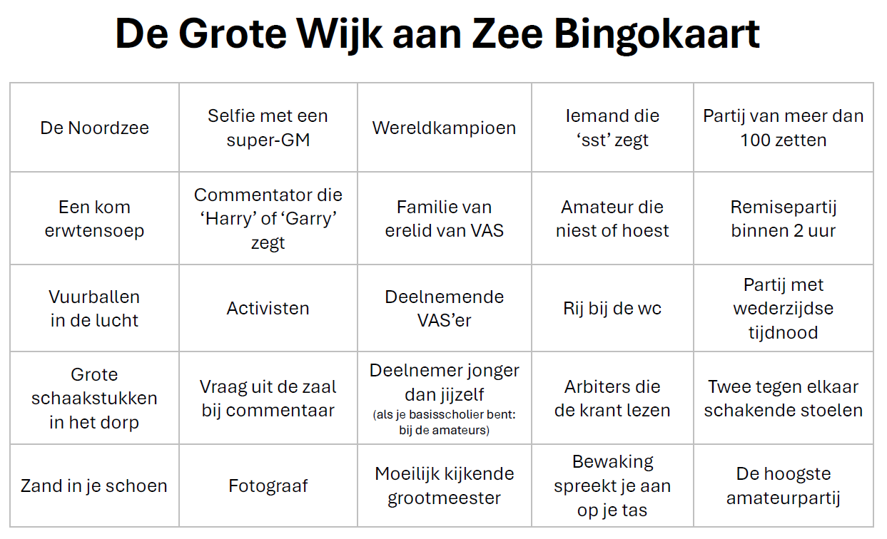 We gingen voor het eerst op uitje naar het grote schaaktoernooi in Wijk aan Zee! En dat werd misschien wel de leukste dag uit de geschiedenis van de VAS-jeugd. Ook de seniorenleden hebben zich uitstekend vermaakt en maakten graag gebruik van de enige echte VAS-bus.