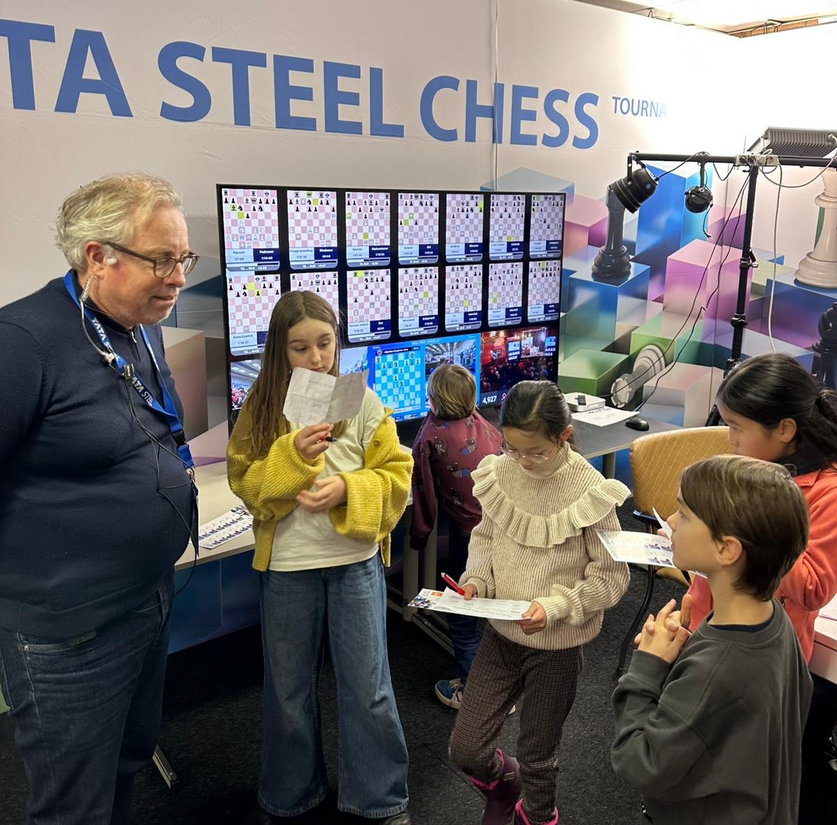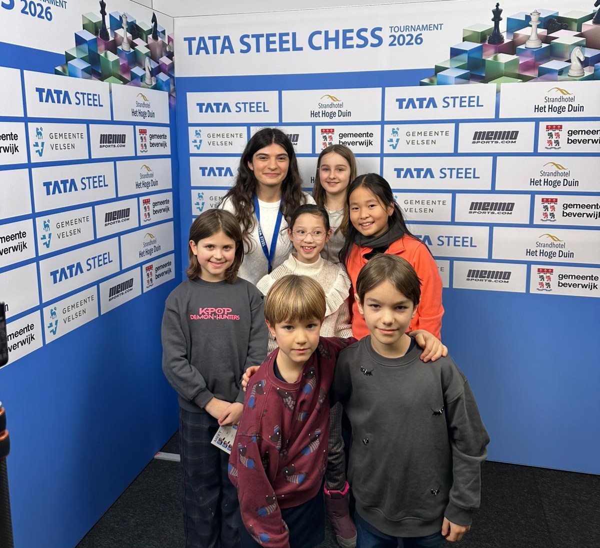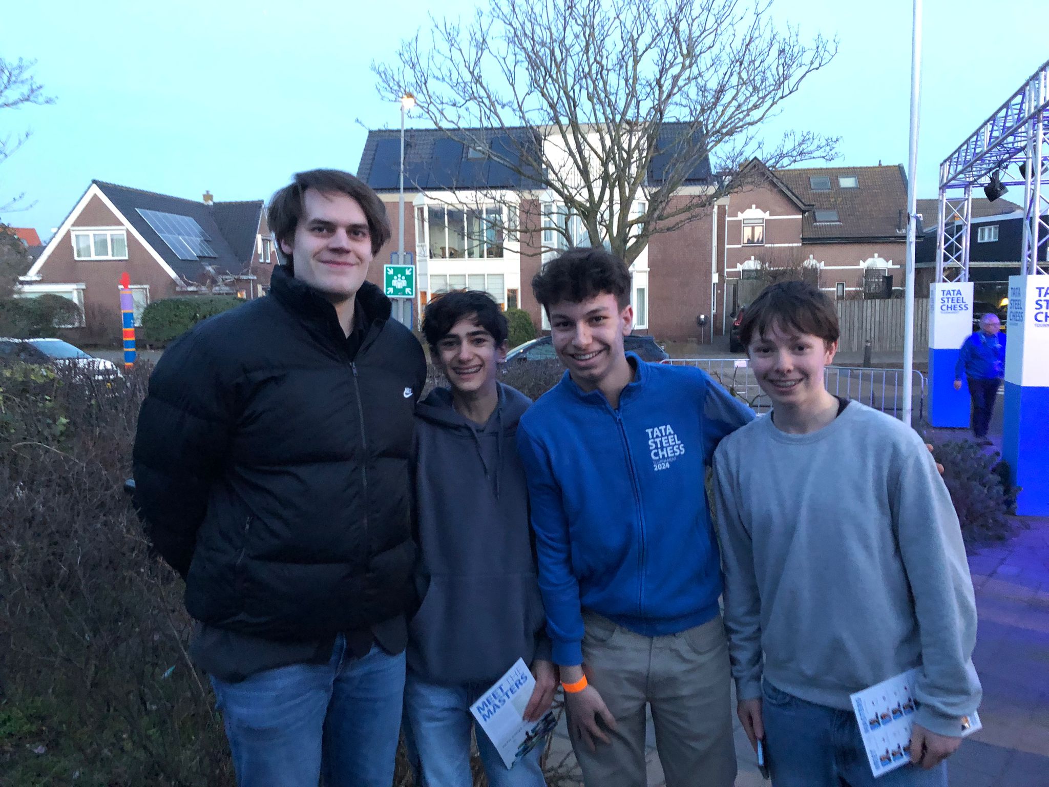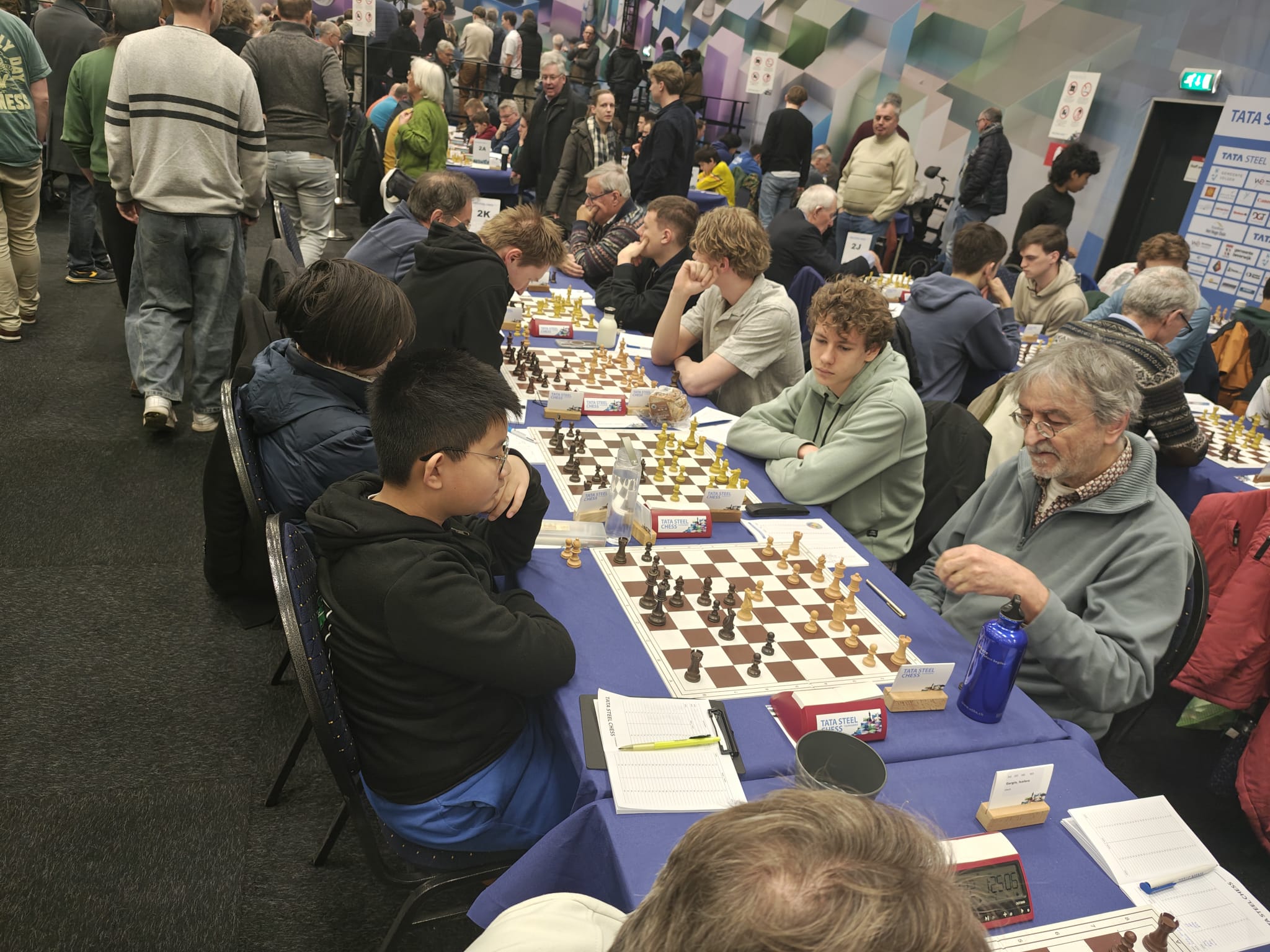 Ze trokken natuurlijk naar de grootmeesterpartijen die net begonnen waren. Ja, daar zitten ze echt allemaal! De super-GM’s: de besten van de wereld. Wereldkampioen Gukesh, neerlands trots Anish Giri en Jorden van Foreest (de betoverkleinzoon van VAS-erelid Arnold van Foreest), en regerend Wijk-Aan-Zeekampioen Praggnanandhaa. En een grote bekendheid schaakte mee bij de Challengers! Eline Roebers was een goede partij tegen een sterke grootmeester aan het spelen. Sommigen zagen hun trainer Take schaken bij de amateurs, en hun jeugdclubgenoten Raghav, Shashank en Zinedine waren ook aan hun partijtje begonnen, want zij hadden vrij van school gekregen om met de tienkampen mee te spelen.