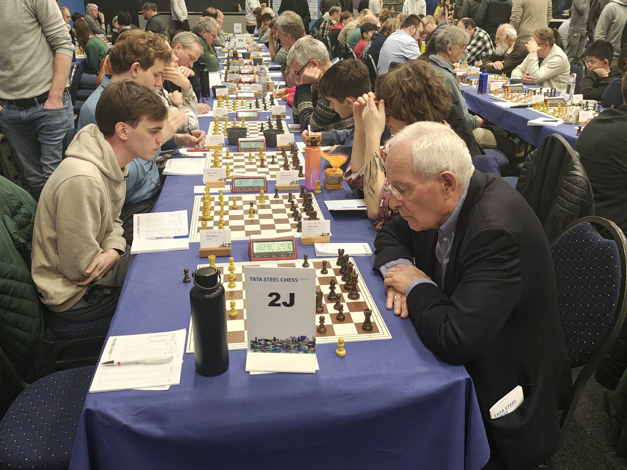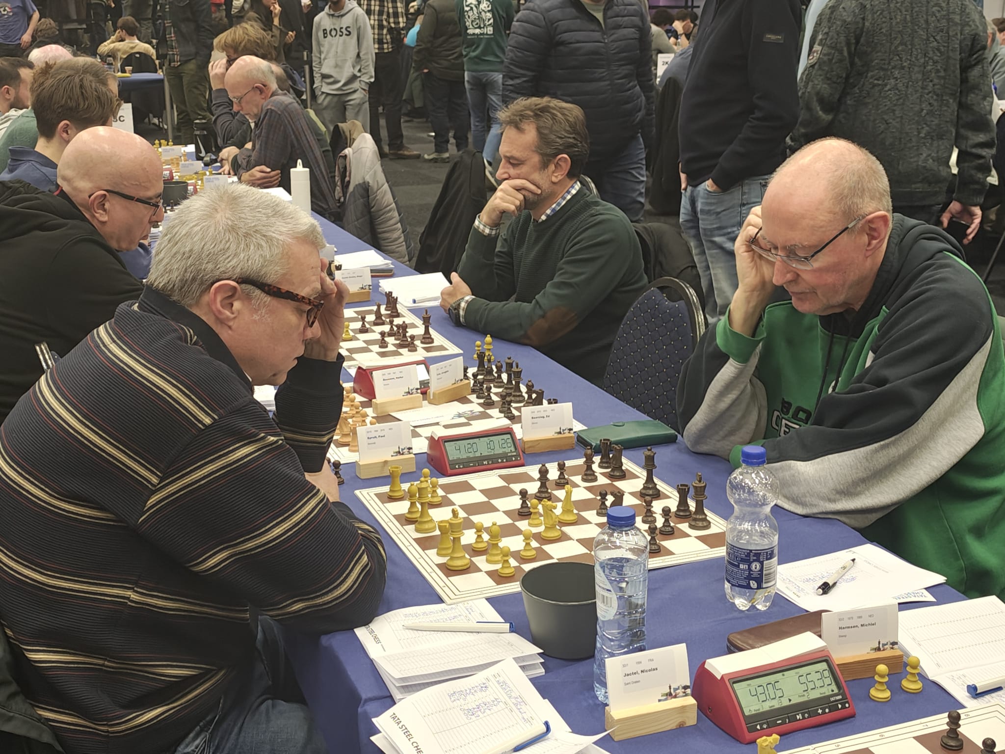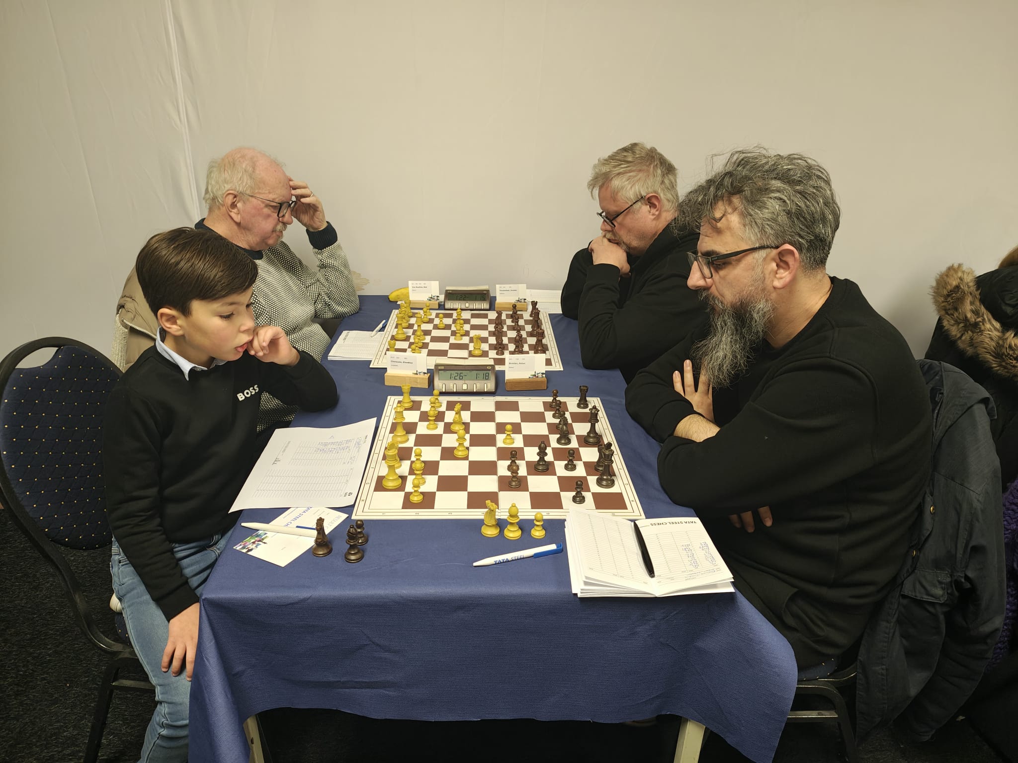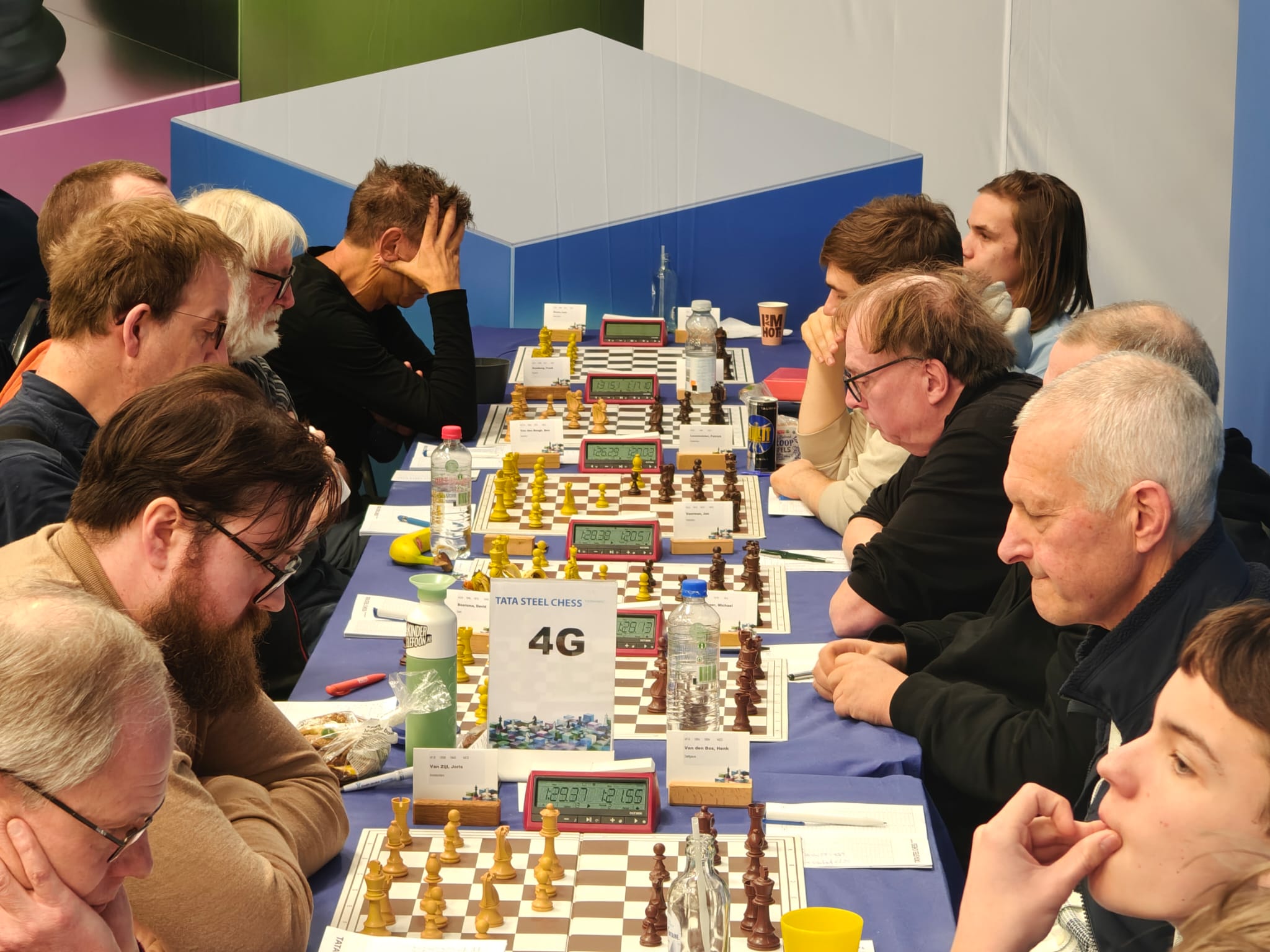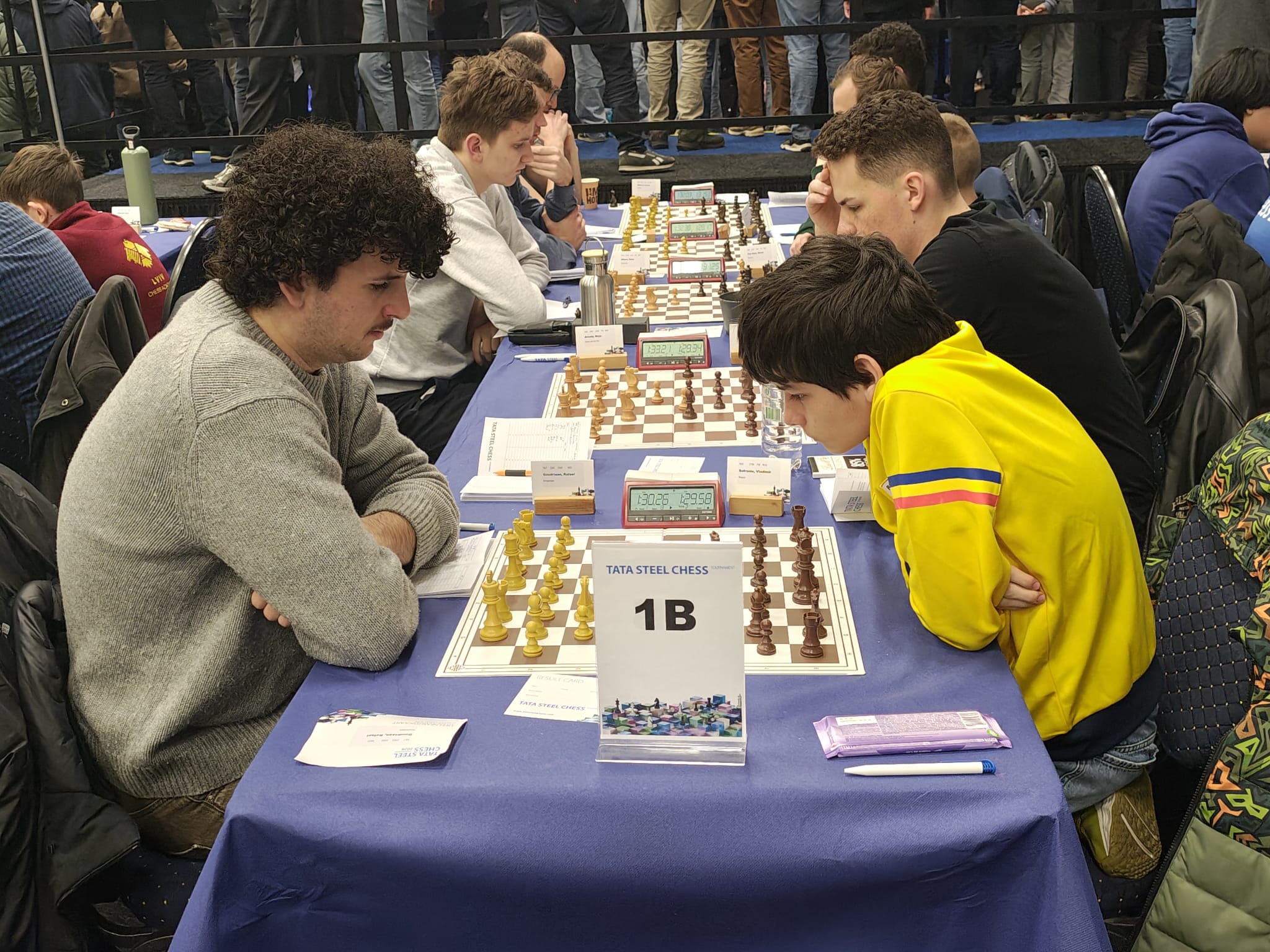 Ze trokken natuurlijk naar de grootmeesterpartijen die net begonnen waren. Ja, daar zitten ze echt allemaal! De super-GM’s: de besten van de wereld. Wereldkampioen Gukesh, neerlands trots Anish Giri en Jorden van Foreest (de betoverkleinzoon van VAS-erelid Arnold van Foreest), en regerend Wijk-Aan-Zeekampioen Praggnanandhaa. En een grote bekendheid schaakte mee bij de Challengers! Eline Roebers was een goede partij tegen een sterke grootmeester aan het spelen. Sommigen zagen hun trainer Take schaken bij de amateurs, en hun jeugdclubgenoten Raghav, Shashank en Zinedine waren ook aan hun partijtje begonnen, want zij hadden vrij van school gekregen om met de tienkampen mee te spelen.
