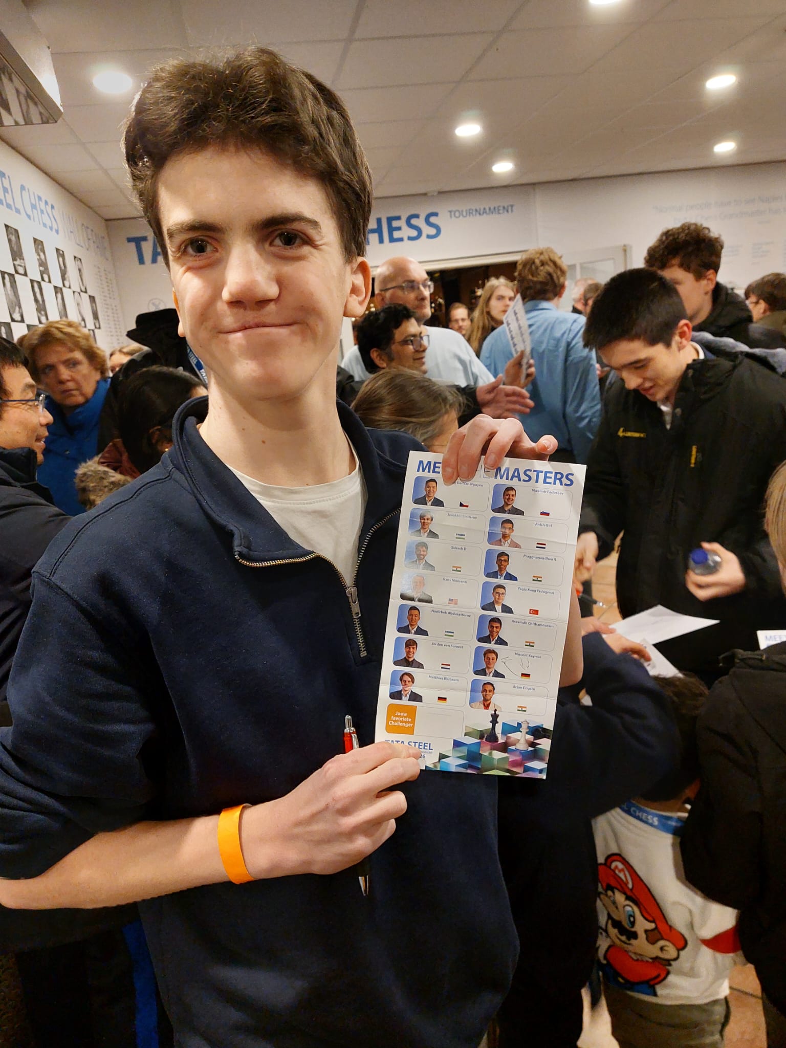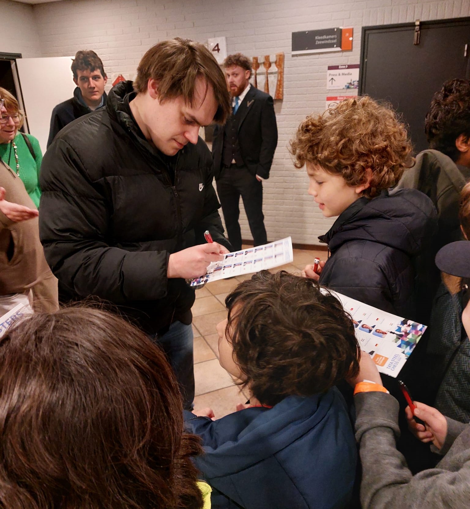 Het was totale chaos, maar ook erg vermakelijk. Uzay, Pengcheng, Sami, Tjibbe, Atlas, Daniël, An, Raayan en Loek waren verslaafd hieraan en stonden minstens een uur om zoveel mogelijk krabbeltjes te krijgen. En gezegd moet worden: dat is best goed gelukt. Na lang wachten kwam Anish Giri uit de coulissen, Jorden van Foreest was de beroerdste niet, ons Duitse VAS-lid Joshua kreeg zowel Keymer als Blübaum op zijn papiertje. Toen Loek de zaal uit kwam, begonnen de VAS-kinderen zelfs om zijn handtekening te bedelen. Oftewel, ze zagen zelf ook wel de humor van de heiligenverering in.