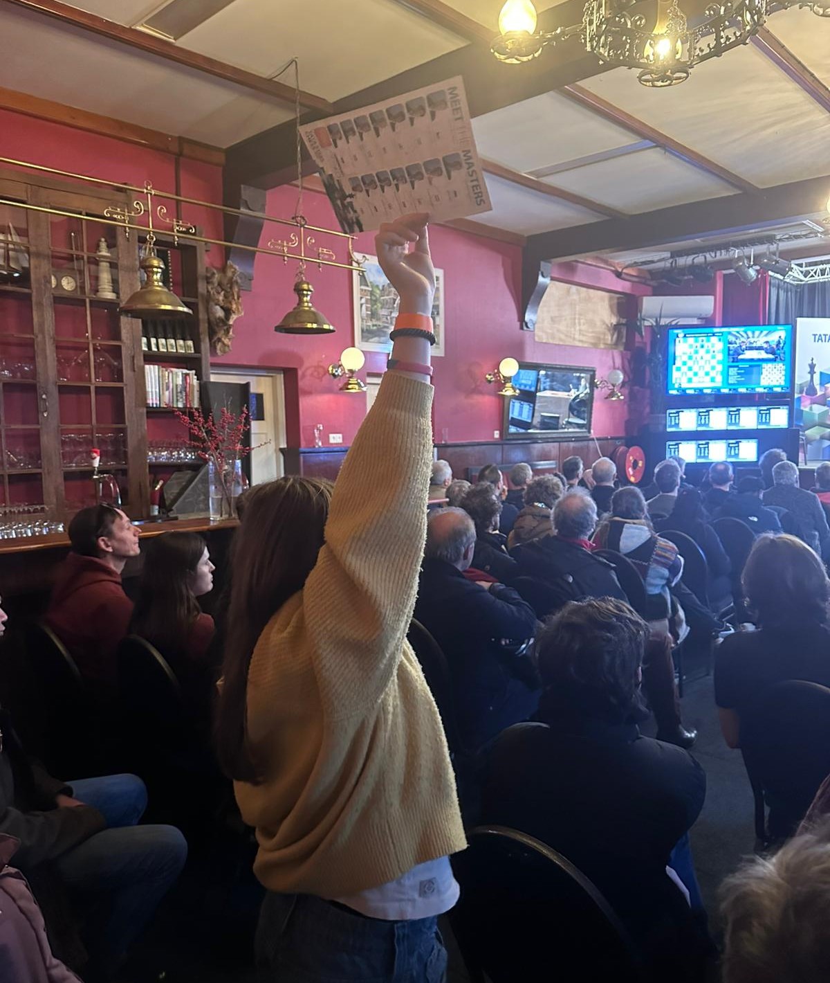 Het leukste moment was echter bij de commentaarzaal. Escher, Emma en Lan hadden een bordje gemaakt. ‘Say Harry or Garry’ stond erop! Want ja, om Eschers bingokaart vol te krijgen, moest commentator Simon Williams zijn beroemde bijnamen voor de h- en g-pionnen noemen. Het leverde een grappig moment op, want Simon Williams (een paar dagen geleden nog door Luc van Schiphol opgehaald) zag dat bordje en reageerde er sportief op. Zo kwamen de VAS-meiden prominent in beeld tijdens de livestream, want de camera’s hielden hier wel van. Heel grappig!