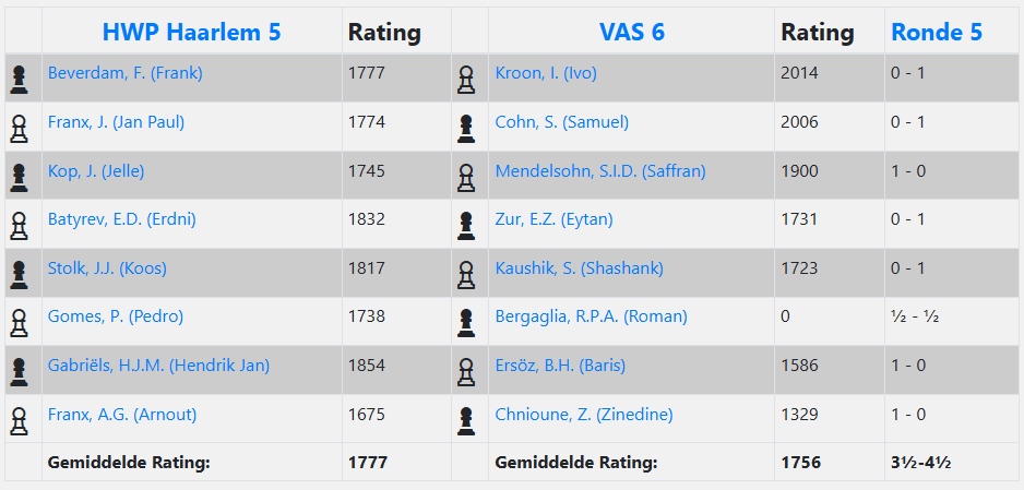 Het was dus aan Roman om het beslissende halfje binnen te slepen. Hij wist al niet wat hij meemaakte toen hij begin dit seizoen werd gevraagd voor het jeugdteam van VAS in de nationale competitie. Langzaam is het besef gekomen bij hemzelf dat hij misschien wel best goed kan schaken. Hij voelde dat hij met iets groots bezig was. Het sluimerde afgelopen maanden door. Het kan niet anders dan dat Roman veel geoefend heeft, want hij bereikt nu echt een ander niveau. Op deze dag wist hij dat beslissende halfje te scoren. 3,5-4,5 voor VAS 6 dus!