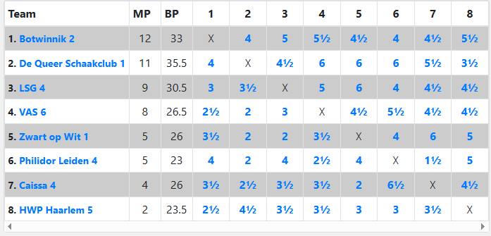 Eytan wist op de wedstrijddag de topscoorderstitel veilig te stellen. 4 bordpunten! Evenveel als de teamleider, maar die moest vanwege zijn zwakke spel aan het begin van het seizoen altijd op lagere borden dan Eytan spelen. Dus Eytan zat gemiddeld op een hoger bord, en zijn vier matchpunten zijn dus veel knapper. Gefeliciteerd!