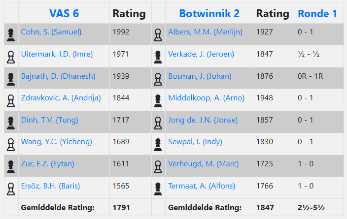 Dhanesh speelde een gestoorde partij en won die. Alleen kopen we er weinig mee, want hij was een ronde eerder kennelijk uitgekomen voor DD. Partij ongeldig verklaard en een teamgenoot verloren voor de rest van het seizoen. Helaas pindakaas.