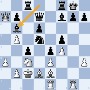 Emilien slaat het zwarte paard op d5 en slaat daarmee twee vliegen in één klap. Als zwart de witte dame slaat, kan het paard daarna doorspringen naar f6 voor een koninklijke dubbele aanval. Het paard staat hartstikke veilig op f6 vanwege een penning. Maar als zwart niet de witte dame slaat, maar het paard terugpakt, dan hangt de zwarte loper op b6 opeens, en kan Emiliens dame die met een gerust hart slaan.