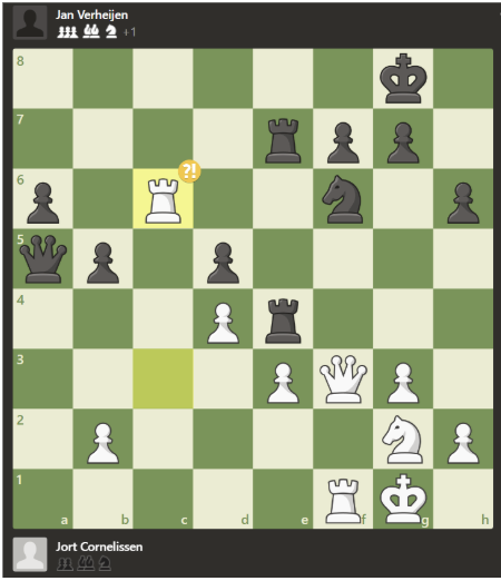 Voor Jort liep dit gambiet met een sisser af. In een draak van een partij – dan hebben we het niet over een Sicilaanse draak – stond hij aan de vooravond van een zekere nederlaag. Echter, besloot de tegenstander de verdediger van de toegangspoort te verwijderen. Vier zetten nadien was mat onhoudbaar en zijn perfecte score bleef in stand; 1-0.