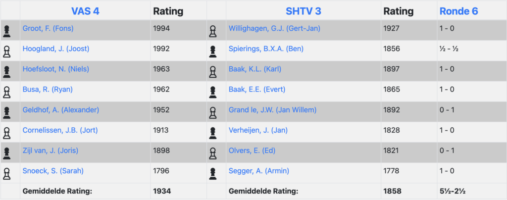 Voor de fanatieke volgers onder jullie zullen de geheimen van VAS IV nog onbekend zijn. In stilte hebben wij ons een weg door tegenstanders geslagen om ons bekend te maken op het juiste moment. Dat moment is nu. Op 7 maart aanstaande gaan wij een gooi doen naar de schaakkroon van KNSB-klasse 5k. In een direct gevecht met Fianchetto I in Schiedam zal hier ons lot worden beslist. Lukt het onze de muren te bestormen, wordt de titel buitgemaakt of gaan wij aldaar dan toch ons Waterloo vinden. U merkt de schrijver is al erg enthousiast, maar in plaatst van een uitgebreide voorbeschouwing zal hier een terugblik vormen over hoe wij ons in deze positie hebben gemanoeuvreerd.
