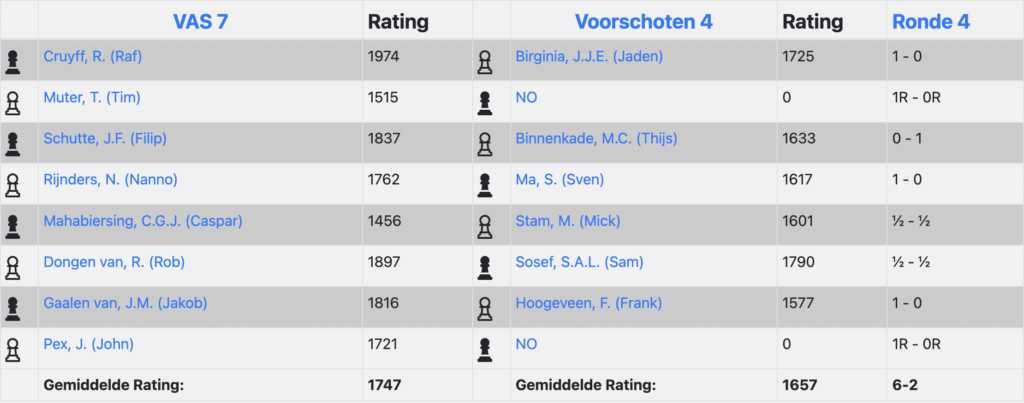 Wat hebben we op deze zaterdagmiddag in december beleefd, geleerd en gevoeld. Zoals Wally Tax en de outsiders een stem waren voor hun generatie, zo zijn wij als VAS7 een stem voor de onopvallende schaker met ambitie. Wij zullen nooit grote toernooien winnen, een prijs winnen voor de meest superieure combinatie of een beker voor het sterkste team in Europa. Maar wij zijn wel VAS7 en wij gaan in de zesde klasse proberen bovenaan te eindigen. In ons eigen universum, bij onze eigen club in onze eigen wereld. Want ongeslagen bovenaan staan we nog steeds !