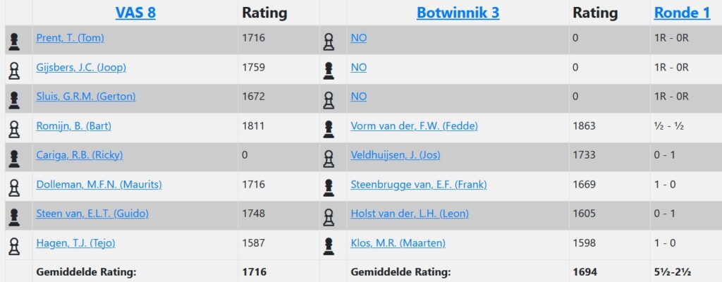 Voor VAS 8 begon de wedstrijd al vrijdagavond. Onze team captain Gerton kreeg het bericht dat Botwinnik 3 slechts met 5 man zou opkomen en de eerste drie borden zou open laten. Op zich prachtig, een 3-O voorsprong, maar tegelijk een dilemma: zou Botwinnik hun sterkste spelers doorschuiven naar de lagere borden en moeten wij dan hetzelfde doen? Maar dat zou betekenen dat weer anderen opeens zonder partij zouden zitten. Of moeten we gewoon loten?