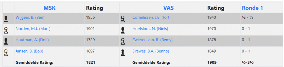 Aan het eerste bord werd door Jort en Ben Wijgers – tevens VAS lid – een meer dan leuk toetje geserveerd. Althans, de metafoor van een soeppan die iets te lang op het vuur stond was hier beter van toepassing. Nadat beide spelers zeer zorgvuldig hun stukken hadden gepositioneerd in een Koning-Indische stelling, kookte de pan over. Beide schakers gingen rucksichtslos voor het hoofd van de vijandige koning, waarbij Ben na enkele mooie tactieken hier eerder in slaagde. Laten we het eufemistisch uitdrukken door te stellen dat hij COMPLEET gewonnen stond; maar daar kwam ineens vrouwe Caissa Jort te hulp. Ondanks een torenachterstand kwam er voor Jort een eeuwig schaak op het bord; of hij er in slaagde dit correct uit te voeren valt te betwijfelen. Maar na ruim 3.5 uur en meerdere schaakjes in het vooruitzicht besloot Ben het remiseaanbod te accepteren. Eindstand: 3.5 – 0.5.