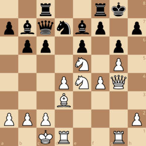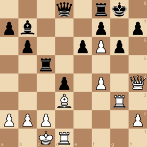 22. f5 (interferentie) exf5 23. Rh3 h5 24. Qxh5 opgegeven wegens mat.